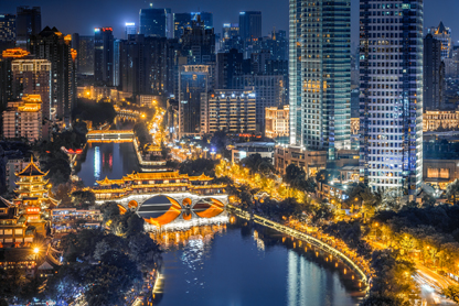 位于成都市主干河道的安顺廊桥有着悠久历史。夜幕降临,桥身上的灯光与锦江之水遥相辉映,彰显出时代新貌。