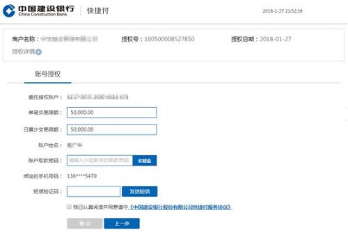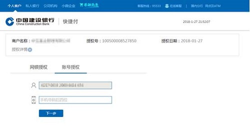2.在建行快捷付开通页面,选择网银授权或账号授权,此处以账号授权为例,输入账号、手机号码后四位,点击下一步。