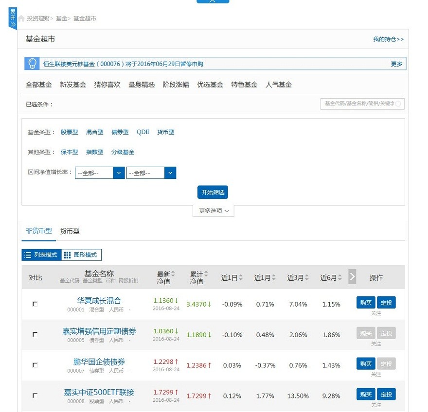 登录建行网银,进入投资理财下基金功能,在基金超市页面,选择需要的基金产品,点击“购买”。注:若是首次在我行购买基金,需先开通基金服务。
