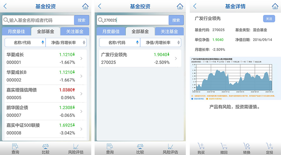 进入手机银行投资理财->基金投资菜单,通过全部基金产品列表选择或输入搜索条件查询需要的基金产品,显示基金详情页面,点击底部“购买”按钮。