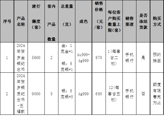 根据中国人民银行贵金属纪念币发行安排,“2024年贺岁金银纪念币”已于近日公告发行,我行根据安排将参与本产品的销售工作。现将有关事项公告如下: