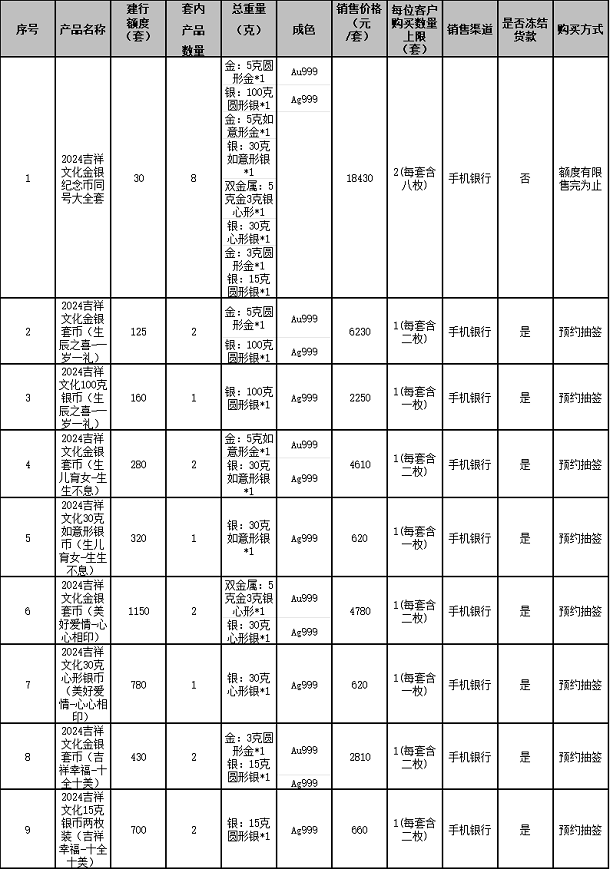 1.应有关要求,本次贵金属纪念币面向实名客户销售,2024吉祥文化金银纪念币同号大全套不限制客户星级,产品额度有限,售完即止。其余各规格采用“预约抽签”方式确定可购买的客户。本产品对应的每位客户购买数量上限等请见本公告第一条中“具体产品信息”内容。