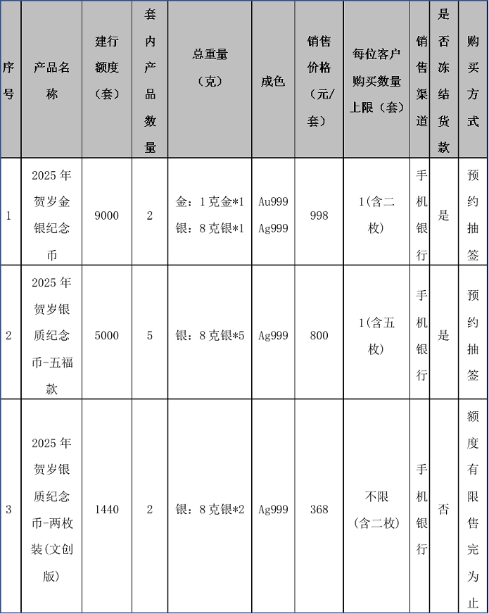 根据中国人民银行贵金属纪念币发行安排,“2025年贺岁金银纪念币”已于近日公告发行,我行根据安排将参与本产品的销售工作。现将有关事项公告如下: